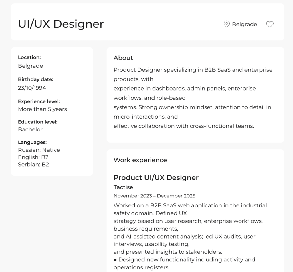 Заполните короткую форму о вашем опыте, навыках и карьерных целях. Ovde Jobs автоматически создаст профессиональное резюме, которое будет доступно компаниям и рекрутерам в нашей базе талантов